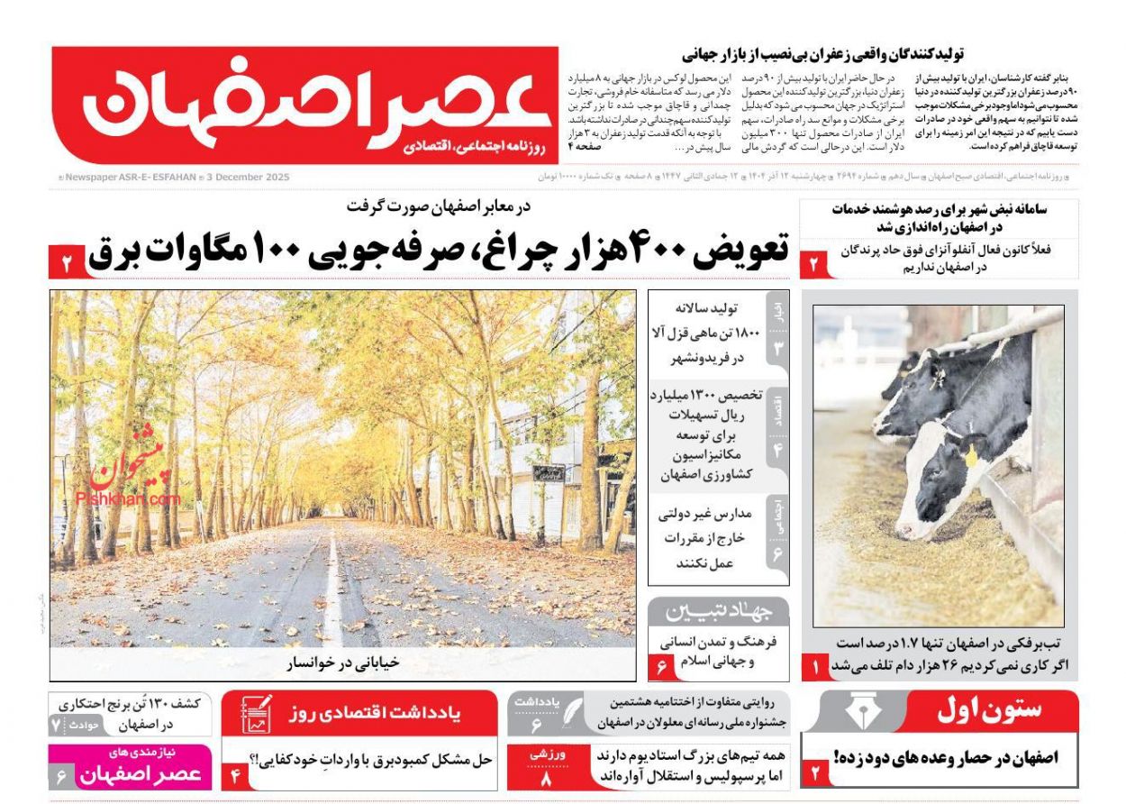 عصر اصفهان ، چهارشنبه ۱۲ آذر