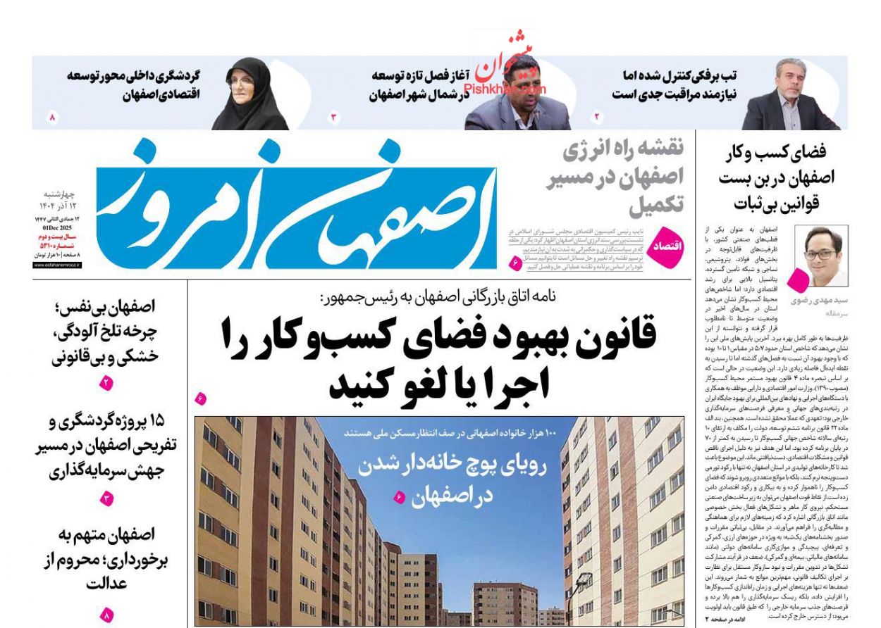 اصفهان امروز ، چهارشنبه ۱۲ آذر