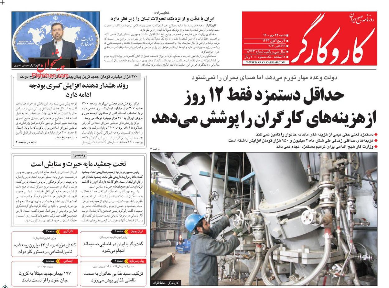 کار و کارگر ، شنبه ۲۴ مهر