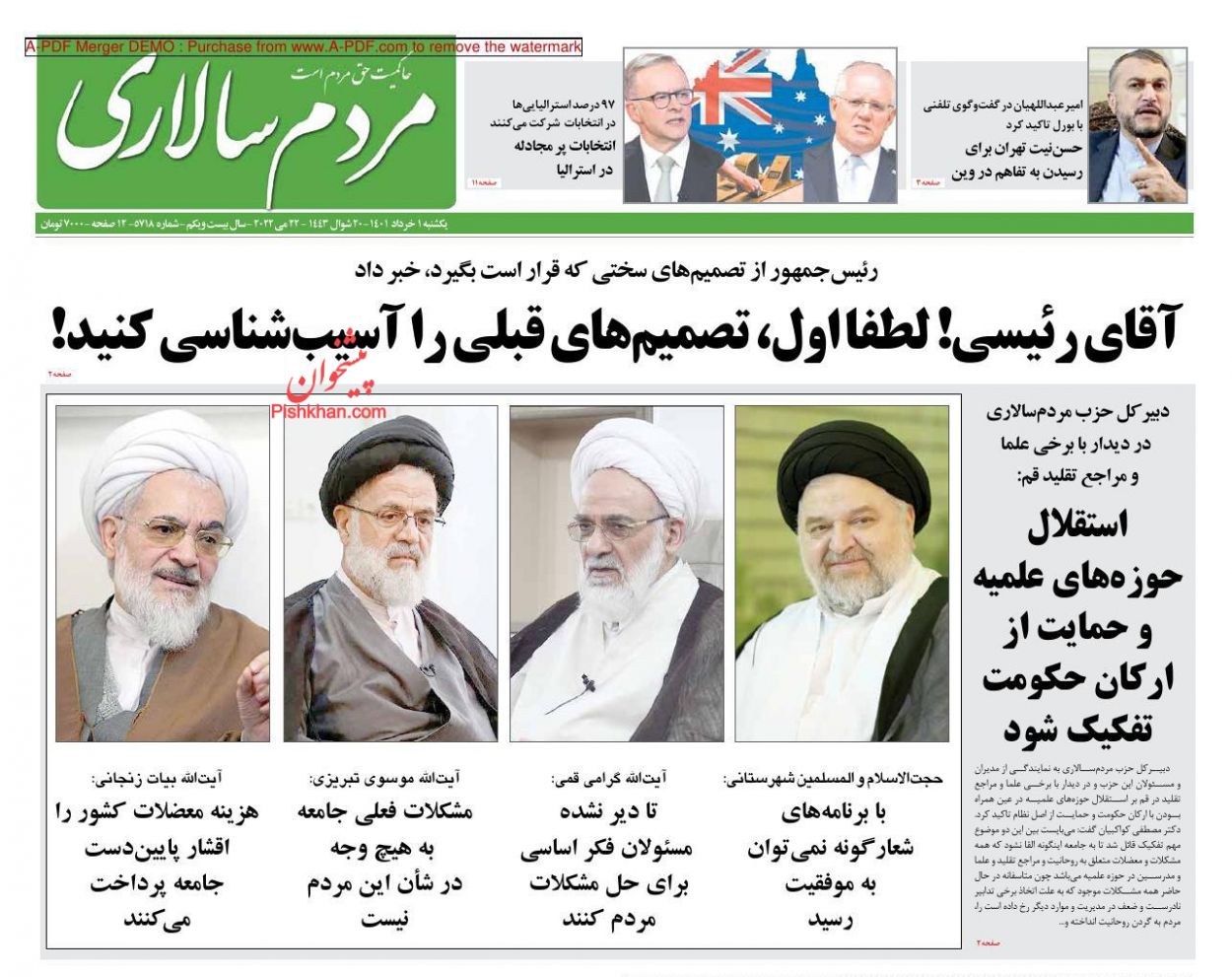 مردم سالاری ، شنبه ۳۱ ارديبهشت