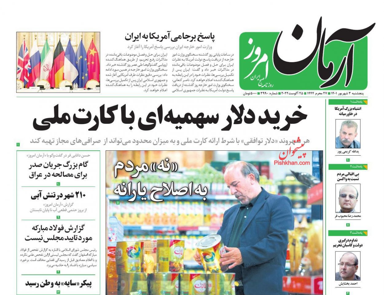 آرمان امروز ، پنجشنبه ۳ شهريور