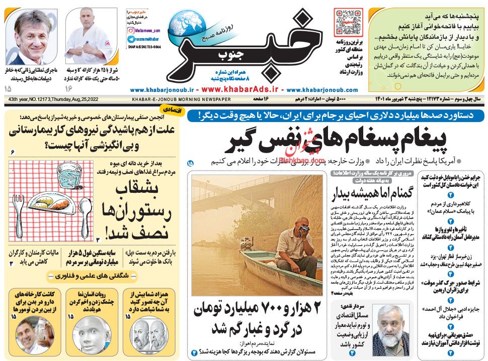 خبر جنوب ، پنجشنبه ۳ شهريور