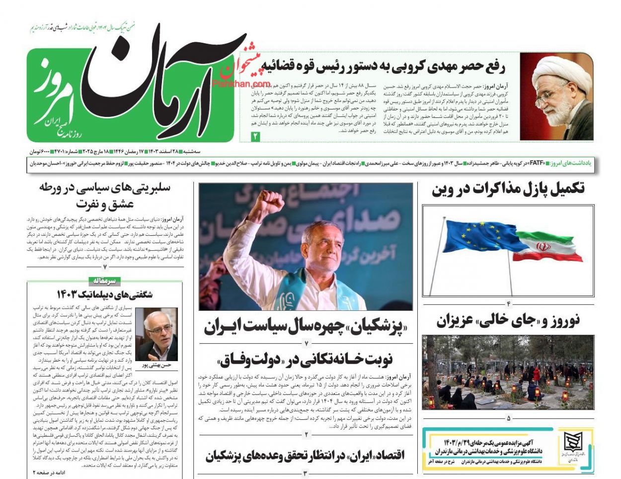 آرمان امروز ، سهشنبه ۲۸ اسفند