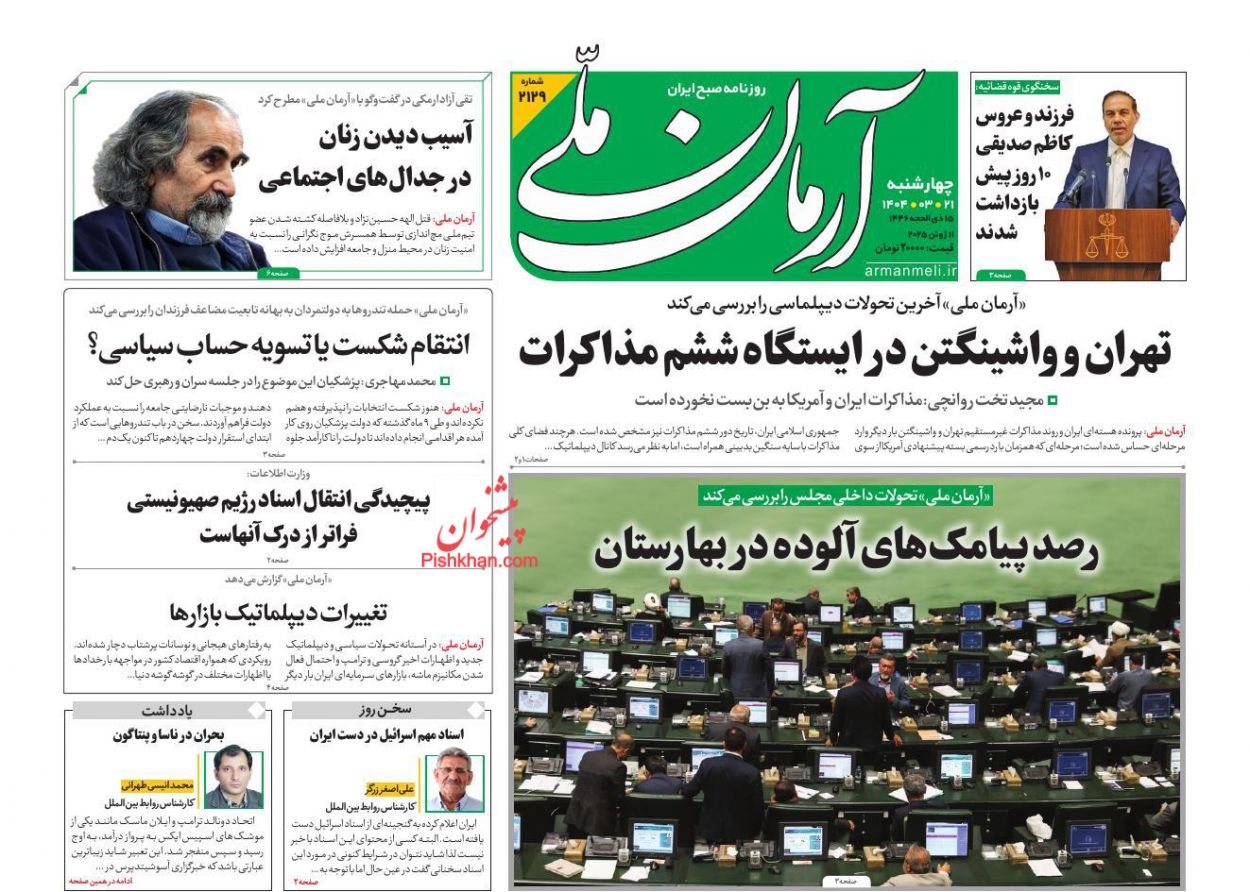 آرمان ملی ، چهارشنبه ۲۱ خرداد