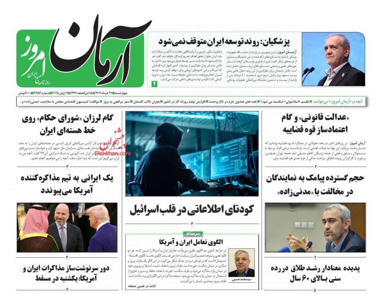 آرمان امروز ، چهارشنبه ۲۱ خرداد