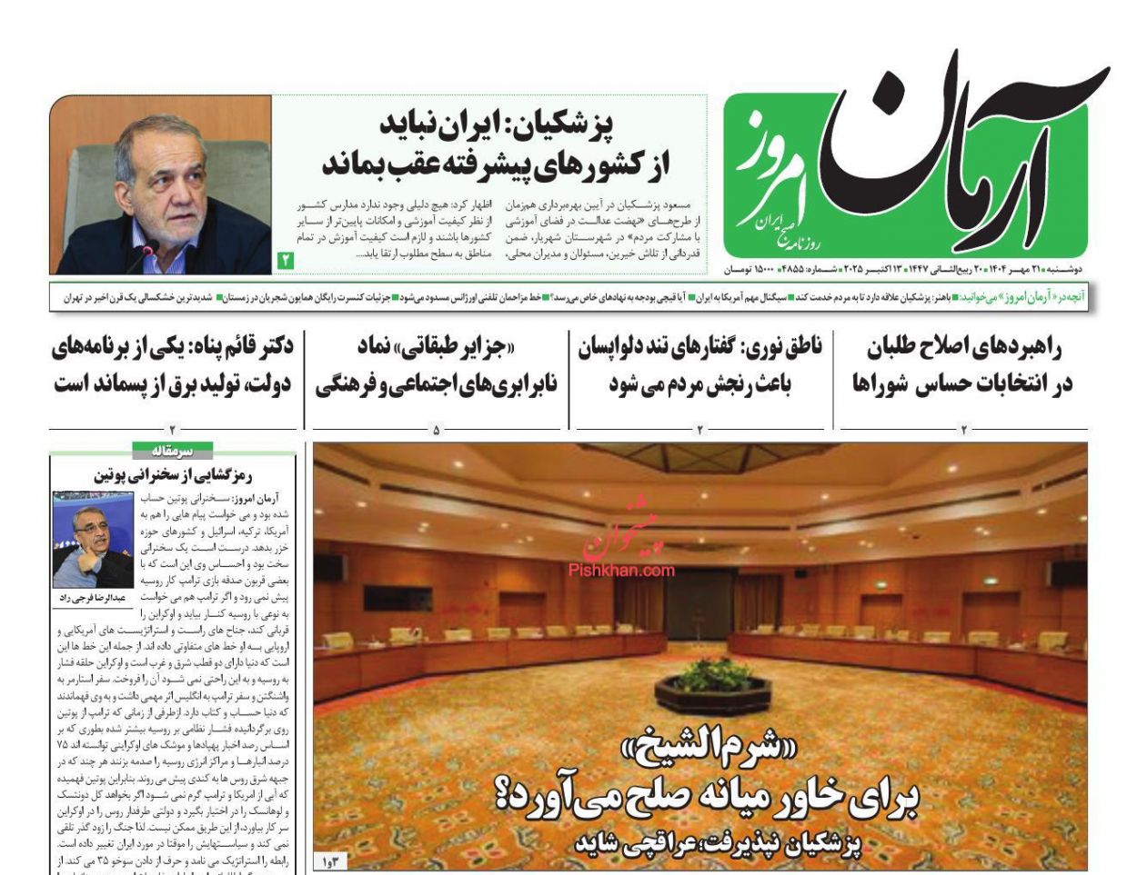 آرمان امروز ، دوشنبه ۲۱ مهر