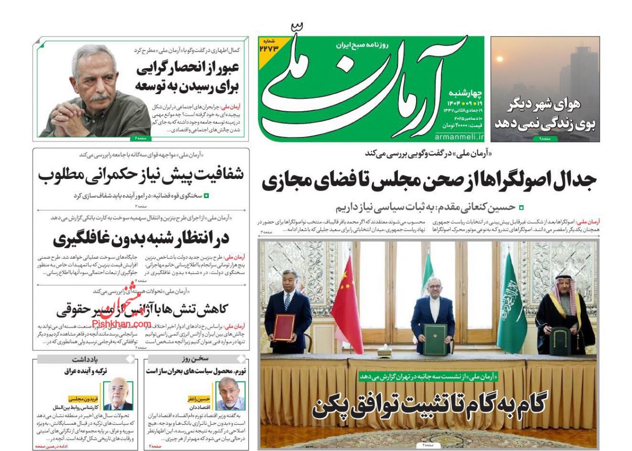 آرمان ملی ، چهارشنبه ۱۹ آذر