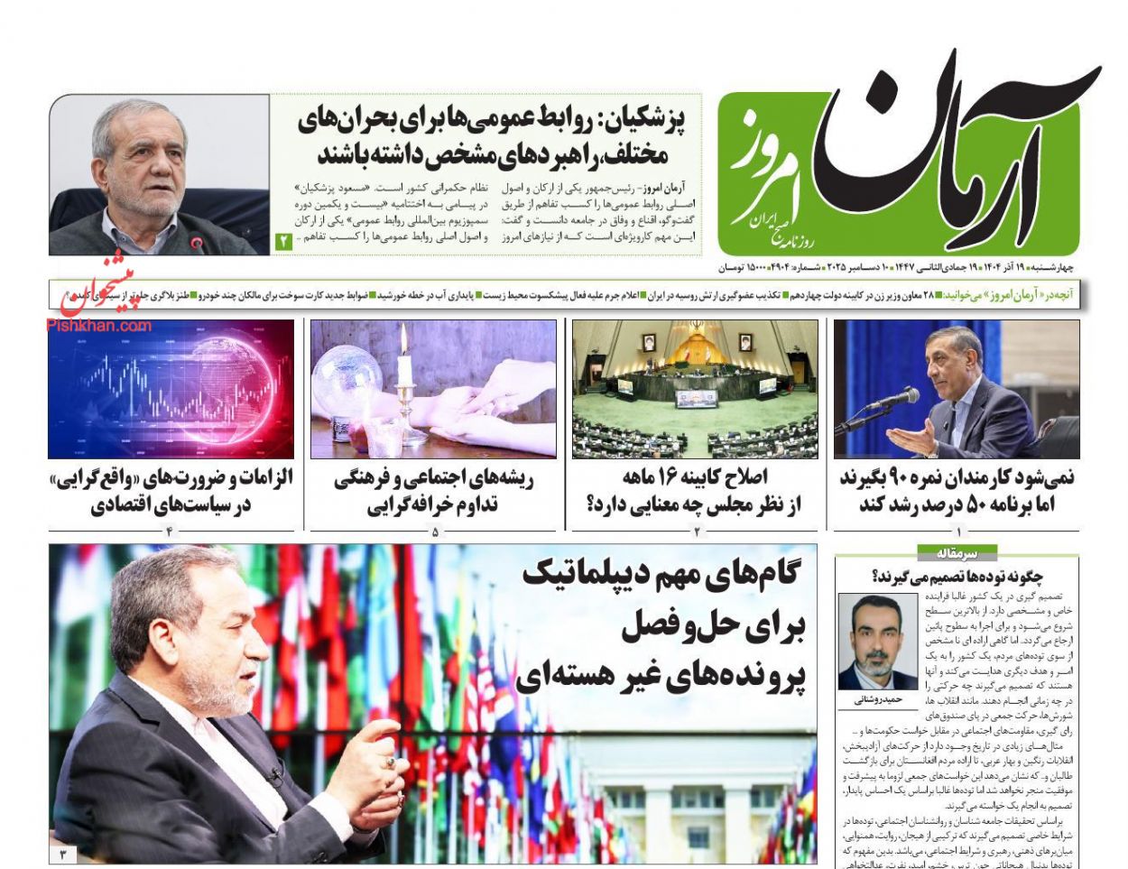 آرمان امروز ، چهارشنبه ۱۹ آذر