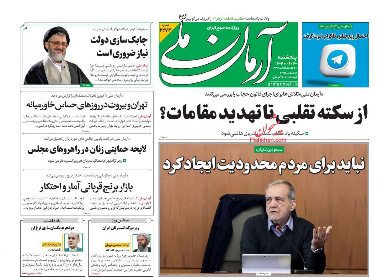 آرمان امروز ، پنجشنبه ۲۰ آذر