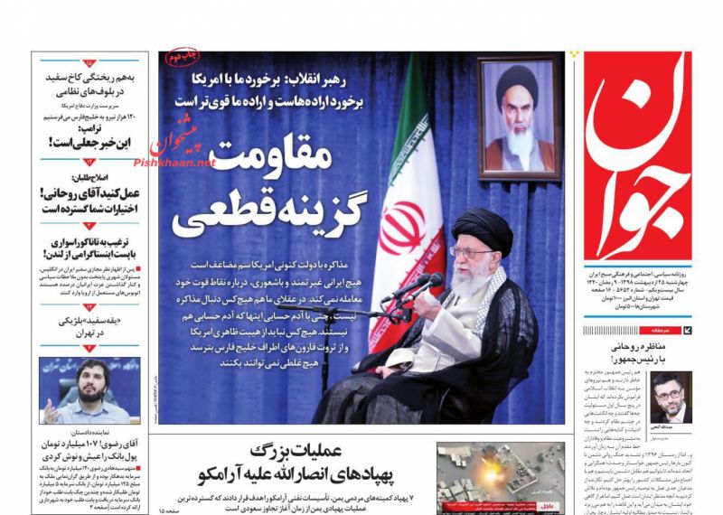 رهبر انقلاب با اشاره به اینکه امریکا مجبور به عقب نشینی در مقابل مقاومت ملت ایران خواهد شد افزودند: بحث مقاومت، بحث برخورد نظامی نیست و اینکه برخی در روزنامه یا فضای مجازی مسئله جنگ را مطرح میکنند، حرف بیخود و غلطی است.