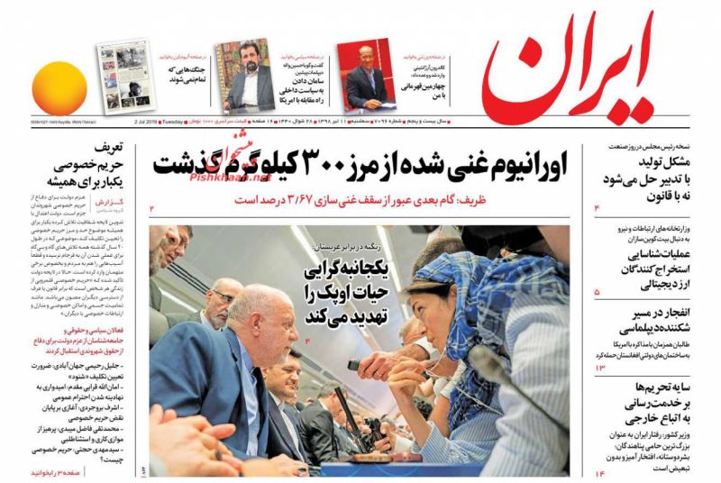 وزیر خارجه افزود: در نامه رئیس جمهوری هم صراحتاً بیان شده که اگر آنها اقدامات لازم را برای اجرای تعهداتشان انجام دهند، اقدامات ما قابل بازگشت است اما اگر اقدامات لازم را انجام ندهند ما بر اساس ماده ۳۶ برجام این حق را از سال گذشته داشتیم که اقدامات خود را انجام دهیم. دیروز همچنین آژانس بینالمللی انرژی اتمی عبور ذخایر اورانیم غنیسازی شده ایران از مرز 300 کیلوگرم را تأیید کرد. سخنگوی آژانس بینالمللی انرژی اتمی در بیانیهای اعلام کرد: «یوکیو آمانو»، دبیرکل آژانس بینالمللی انرژی اتمی به اطلاع شورای حکام رسانده است :«آژانس در یکم ژوئیه، عبور ذخایر اورانیم غنیسازی شده ایران از محدودیتهای توافق هستهای را تأیید میکند.»