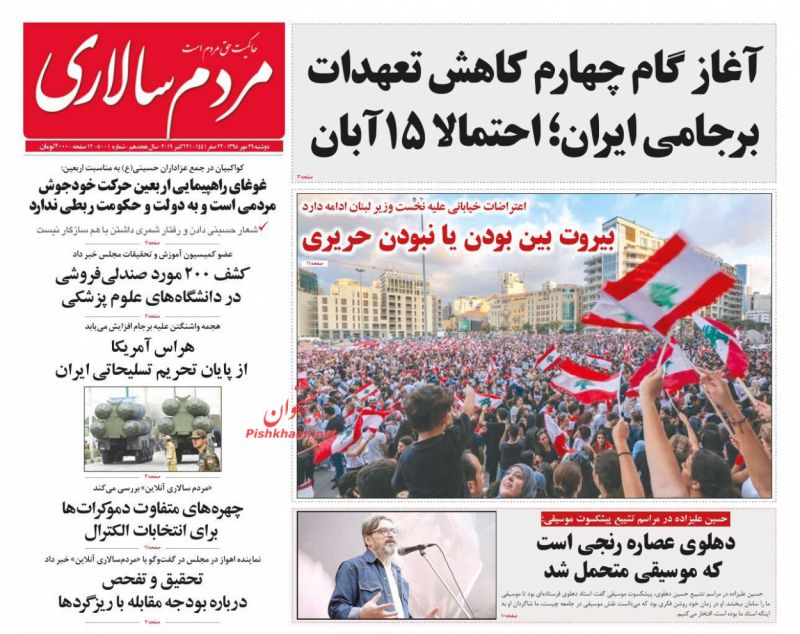 لبنان صحنه جنبشهای اعتراضآمیز و تجمع صدها لبنانی در بیروت و دیگر مناطق پایتخت در اعتراض به تصمیم دولت برای اعمال مالیاتهای جدید و نابسامانی شرایط اقتصادی است. در این میان همه گزینهها در خصوص نخست وزیر این کشور از جمله استعفا یا کنار نشستن وی از فعالیتها وجود دارد. یکی از احزاب مسیحی لبنان اعلام کرد که در پی اعتراضهای مردمی از دولت ائتلافی کنارهگیری میکند. «سمیر جعجع» رهبر حزب نیروهای لبنانی گفته: «اکنون ما متقاعد شدهایم که دولت در برداشتن گامهایی برای حفظ وضعیت ناتوان است. بنابراین این مجموعه تصمیم گرفت تا وزیرانش از دولت استعفا کنند.» اعلام استعفای حزب نیروهای لبنانی از دولت ائتلافی در حالی است که به گفته وزیر دارایی لبنان، در پی نشستی با حضور سعد حریری، نخست وزیر این کشور موافقت شده تا در «بودجه نهایی» به میزان مالیاتها افزوده نشود. منابعی در نهادهای وزارتی لبنان به روزنامه الشرق الاوسط چاپ لندن گفتند، اگر ابتکارعمل سعد حریری، نخست وزیر لبنان پاسخ مثبت سیاسی دریافت کند، جلسه دولت جهت تصویب آن و شروع اجرای این ابتکارعمل برگزار میشود اما مساله مهم نوع برخورد تظاهرکنندگان با این ابتکارعمل است و اینکه آیا معترضان آن را خواهند پذیرفت و از مطالبات خود که کمتر از استعفای دولت را نمیپذیرند، عقب خواهند نشست؟ فعلا در جواب این پرسش باید گفت که منهای حزب افراطی نیروهای لبنانی ، احزاب دیگر به پیشنهاد نخست وزیر چراغ سبز نشان دادهاند.ادامه اعتراضات در چهارمین روز