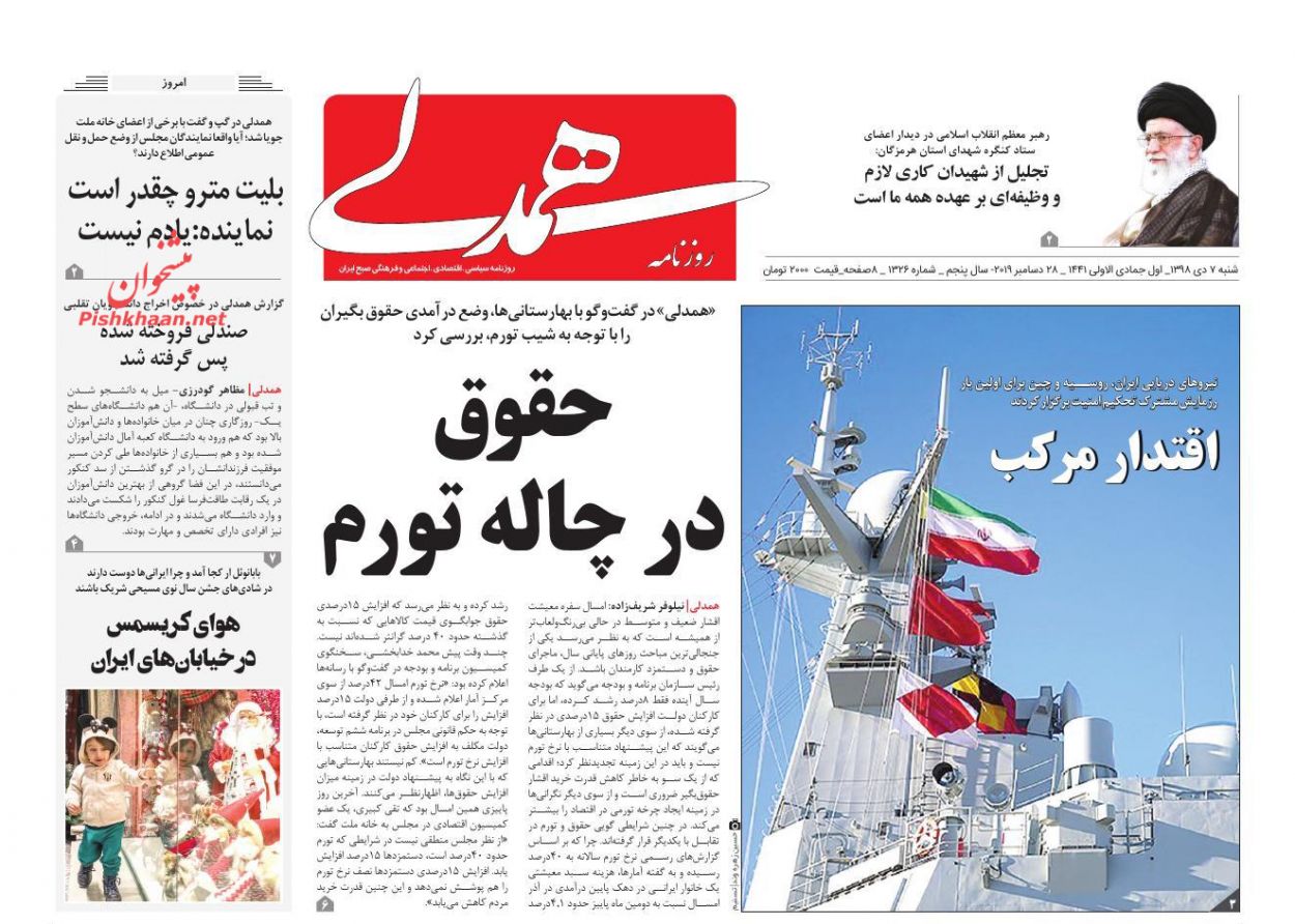 اقتدار مرکب در منطقههمدلی| روز گذشته معاون عملیات نیروی دریایی ارتش از آغاز برگزاری رزمایش بزرگ نیروی دریایی سه کشور ایران، روسیه و چین در شمال اقیانوس هند خبر داد. به دنبال این خبر یگانهای شناور روسیه و چین به منظور شرکت در رزمایش مرکب با جمهوری اسلامی ایران وارد بندر شهید بهشتی چابهار شدند و مورد استقبال قرار گرفتند. در این مراسم ناو روسی «Yaroslav Mudry» به همراه کشتی سوخترسان «Yel›nya» و یدککش «Yevgeniy Khorov» و همچنین ناوشکن چینی «شینینگ» در دریا مورد استقبال ناو موشکانداز «نیزه» قرار گرفتند و با پهلوگیری در اسکله بندر شهید بهشتی چابهار مراسم استقبال و تشریفات رسمی انجام شد.