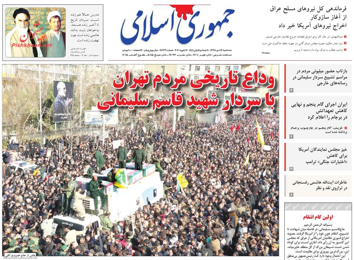 رئیس جمهور در پیامی با تسلیت درگذشت تعدادی از هموطنان در مراسم خاکسپاری سپهبد شهید قاسم سلیمانی در کرمان به معاون اول رئیسجمهور و وزیر بهداشت، درمان و آموزش پزشکی دستور داد تا سریعاً به وضعیت مصدومان و خانوادههای بازماندگان رسیدگی نمایند.دکتر روحانی در این پیام همچنین هیاتی را مامور رسیدگی به دلایل بروز این اتفاق نمود.