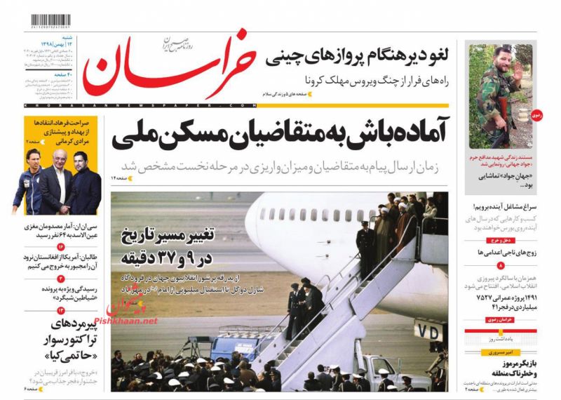 * «باشگاه استقلال ورشکسته است» «در فوتبال، اسنادی دارم که اگر رو کنم سنگ روی سنگ بند نمی شود»«و... اگر می خواستیم متن این خبر را تنظیم کنیم، نمی دانستیم از بین این همه تیتر آتشین، کدام را انتخاب کنیم! درکنفرانس خبری سرمربی استقلال از رقم قراردادش با استقلال گفت و کلی حرف های تکان دهنده از شرایط باشگاه استقلال و مدیران سابقش به زبان آورد. مشروح این مطلب را در صفحات ورزشی بخوانید. * «اسم مزخرف سلبریتی را از روی ما بردارید. ما خود خود مردمیم.» پنج شنبهشب سیزدهمین شب منتقدان و نویسندگان که به دلیل اتفاقات اخیر از «جشن» به «شب منتقدان و نویسندگان» تغییر نام داده بود، برگزار شد. وقتی حامد بهداد برای دریافت جایزه بهترین بازیگر نقش اول مرد، برای فیلم «قصر شیرین» روی سن آمد از حس نزدیکی و همدردی خود با مردم صحبت کرد و گفت: «ما خود خود مردمیم، این اسم مزخرف سلبریتی را از روی صورت ما بردارید.» همین یک جمله کافی بود تا کاربران شبکه های اجتماعی به انتقاد ازاو بپردازند. گزارش مفصلی از جشن منتقدان و حاشیه هایش در صفحه سینما و تلویزیون (6) نوشته ایم. آن را بخوانید. * «قصههای مجید»، «خمره»، «چکمه»، «تنور» و... همه از جمله آثار مرادی کرمانی هستند که بر اساس آنها فیلم سینمایی ساخته شده است. آثار خالق «قصههای مجید» رکورددار اقتباس سینمایی در ایران است. سی و هشتمین دوره جشنواره فیلم فجر از امروز آغاز میشود و به همین مناسبت درصفحه ادب و هنر (11) به سراغ نویسندگانی رفتهایم که بر اساس آثارشان فیلم ساخته شده و در دورههای مختلف این جشنواره حضور داشتهاند.