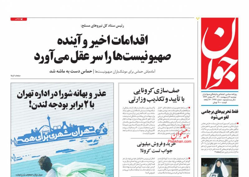 سرویس سیاسی جوان آنلاین: به گزارش روابط عمومی نیروی قدس سپاه، سرلشکر محمد باقری، رئیس ستادکل نیروهای مسلح روز گذشته در حاشیه مراسم بزرگداشت سردار حجازی در جمع خبرنگاران درباره حوادث اخیر در جنوب فلسطین اشغالی گفت: «صهیونیستها فکر میکنند میتوانند به طور دائم خاک سوریه را هدف قرار دهند و در جاهای مختلف و در دریاها شیطنت کنند و پاسخ نگیرند.»وی افزود: «چیزی درباره اقدامگر حوادث اعلام نمیکنیم و نمیدانیم چه کسی است، اما جبهه مقاومت به صهیونیستها پاسخ اساسی خواهد داد.» رئیس ستادکل نیروهای مسلح درباره پاسخ ایران در صورت استمرار شیطنتهای رژیم صهیونیستی گفت: «معلوم نیست پاسخ ایران چه باشد، اما رژیم صهیونیستی آرام نخواهد بود.»