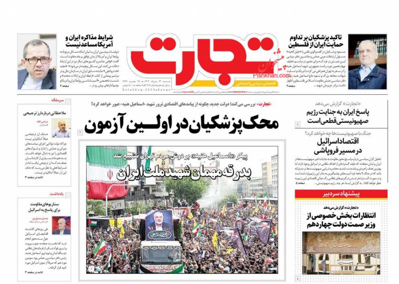 به گزارش تجارت، اسماعیل هنیه رئیس دفتر سیاسی حماس که برای شرکت در مراسم تحلیف مسعود پزشکیان رئیس جمهور کشورمان به ایران سفر کرده بود، بامداد چهارشنبه 10 مردادماه در محل اقامتش در تهران ترور شد و به همراه یکی از محافظینش به شهادت رسید. همچنین،مراسم تشییع پیکر شهید «اسماعیل هنیه» با حضور مقامات کشورها، چهرههای اسلامی، مردمی و عربی دیروز -جمعه- پس از اقامه نماز بر پیکر وی در مسجد «محمد بن عبدالوهاب» دوحه برگزار شد و پیکر وی پس از مراسم تشییع در مقبره «امام الموسس» در «لوسیل» نزدیک دوحه به خاک سپرده شد. دهها هزار نمازگزار بعد از نماز جمعه در مسجد مذکور بر پیکر شهید اسماعیل هنیه به امامت خلیل الحیه، یکی از رهبران مقاومت حماس نماز میت اقامه کردند. «زیاد نخاله» دبیرکل جنبش جهاد اسلامی نیز در این مراسم حضور داشت. خالد مشعل، از رهبران حماس در این مراسم گفت: حماس همان رویکردی را که شهید هنیه ترسیم کرد، ادامه خواهد داد.