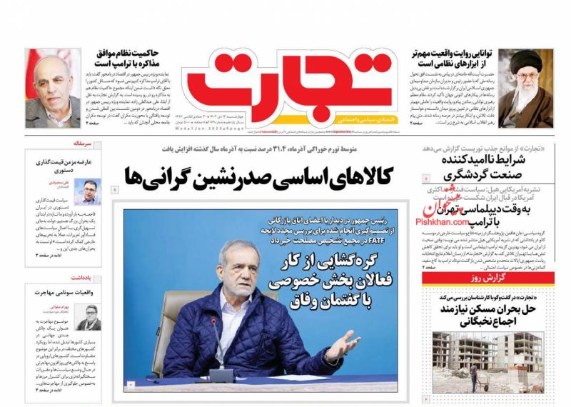 علاوه بر این، شاخص قیمت کالاها و خدمات مصرفی کل کشور در فصل تابستان بر مینای سال ۱۴۰۰ به رقم ۲۶۰ رسیده که درصد تغییرات شاخص در چهار فصل منتهی به تابستان ۱۴۰۳ نسبت به دوره مشابه در سال قبل (نرخ تورم) ۳۴.۲، گزارش مرکز آمار ایران درباره تورم بیست و شش قلم پرمصرف خوراکی منتشر شد که طبق آن متوسط تورم خوراکی آذرماه ۳۱.۴ نسبت به آذرماه سال گذشته افزایش داشته است. به گزارش تجارت، تورم کالاهای خوراکی در آذرماه طبق آخرین گزارش تورم کالاهای خوراکی در مناطق شهری مرکز آمار نسبت به ماه قبل از آن (آبان) افزایش یافته است. طبق این گزارش، هزینه تامین کل سبد مصرف خانوار -شامل خوراکیها، غیرخوراکیها و خدمات- در آذر نسبت به آبان ۲ درصد بالاتر رفته و این افزایش برای تمام اقلام خوراکی ۱.۸ درصد بوده است. براساس دادههای رسمی، تورم سبدی که تغذیه حداقلی هر فرد را پوشش میدهد بالاتر از متوسط تورم بوده است.براساس گزارش مرکز آمار، کالاهای خوراکی پرمصرفی مانند هویج، لیموترش، لوبیا قرمز، لپه و پیاز و فلفل دلمهای و عدس، نسبت به مدت مشابه در سال گذشته طی آذرماه امسال بالای ۶۰ درصد افزایش قیمت داشتهاند و در برخی کالاها مانند لیموترش، هویج و سیب زمینی این افزایش بیش از ۷۰ درصد بوده است. کمترین تغییرات قیمتی نیز نسبت به سال گذشته در کالاهایی مانند روغن و تن ماهی مشاهده میشود.