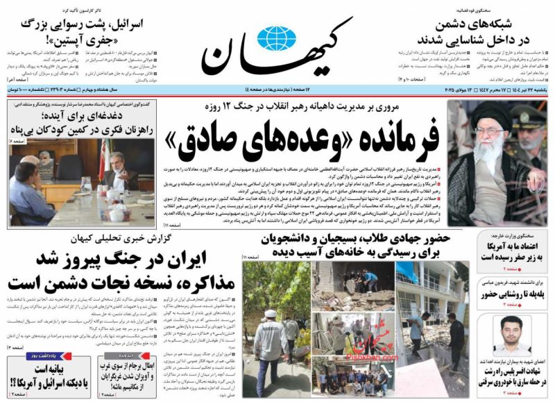 ۳- قبل از شروع جنگ ۱۲ روزه اخیر و چند روزی بعد از شروع آن، هم ترامپ و هم نتانیاهو تاکید داشتند که براندازی «تغییر رژیم - Regime change» هدف راهبردی و نهائی آنهاست. این آرزوی دشمن با پاسخ جانانه و «لهکننده» قوای مسلح جمهوری اسلامی و اتحاد و یکپارچگی مثالزدنی مردم با شکست روبهرو شد. و دشمن که با رجز براندازی و تغییر رژیم آمده بود به دریوزگی و گدایی «آتشبس» رفت.