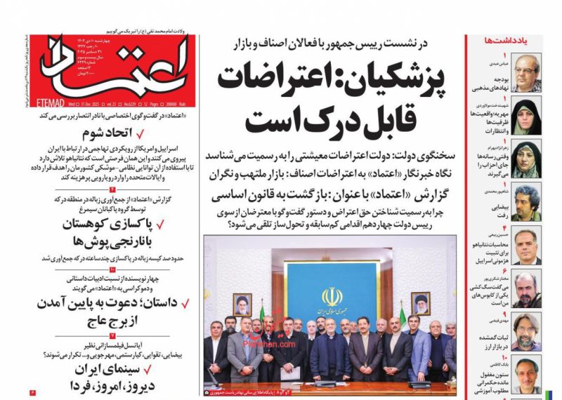 سخنگوي دولت: دولت اعتراضات معيشتي را به رسميت ميشناسد نگاه خبرنگار «اعتماد» به اعتراضات اصناف : بازار ملتهب و نگران گزارش «اعتماد» با عنوان : بازگشت به قانون اساسي چرا بهرسميت شناختن حق اعتراض و دستور گفتوگو با معترضان ازسوي رييس دولت چهاردهم اقدامي كمسابقه و تحولساز تلقي ميشود؟گروه سياسي| در سومين روز اعتراضات صنفي و واكنش به گراني بيرويه قيمت ارز، طلا و سكه، اخبار تاييد نشدهاي از حضور كسبه معترض در مناطقي از تهران و ساير شهرها حكايت داشت، اما ديروز خبرگزاري فارس، گزارش كوتاهي از اعتراضات دانشگاهها به همراه عكس منتشر كرد . فارس در اين گزارش نوشته بود كه تجمعات در چند دانشگاه شهر تهران، محدود و كمجمعيت بود و همچنين در سطح شهر نيز تعدادي از كسبه در بازار آهن تجمع محدودي برگزار كردند . اما در سومين روز اعتراضات صنفي و به دنبال تعطيلي خودجوش صنف موبايل، طلا، خشكبار، پوشاك، لوازم صوتي و تصويري در تهران و چند شهركشور، صبح ديروز رييسجمهور جلسهاي با فعالان اصناف و بازاريان برگزار كرد كه اين جلسه به 4 تصميم مهم و توافق دولت و مجلس براي حمايت از اين قشر و تسهيل فعاليتهاي اقتصادي منجر شد . مسعود پزشكيان در اين جلسه با جمعي از روساي اصناف، اتحاديهها، اتاقهاي بازرگاني و اعضاي هيات امناي بازار، ضمن شنيدن مشكلات، دغدغهها و مطالبات فعالان بازار گفت: «حل مشكلات اصناف و بازاريان را وظيفه خود ميدانيم. اعتراضات شما قابل درك است، اما بايد توجه داشت كه دولت چهاردهم وارث مشكلات انباشته سالهاي گذشته است. با اين حال، با تمام توان و از مسير تعامل و وحدت با مجلس شوراي اسلامي، به دنبال حل مسائل هستيم. وراي همه اختلافنظرها، همه ما مكلف به پيگيري مطالبات اقتصادي جامعه هستيم و دولت و مجلس در اين مسير همنظر و همجهتند.رويكرد دولت، مداخلات حداقلي در بازار است، اما هر جا كه رانت، رشوه و نظام چندنرخي ارز به اقتصاد كشور آسيب بزند، دولت با جديت ورود خواهد كرد و اين پديدهها را از ميان برخواهد داشت. طبيعي است كه مقابله با رانت، با اعتراض رانتخواران همراه باشد، اما منافع مردم و بازاريان در اولويت است.ما در اين مسووليت قرار گرفتهايم تا مشكلات كسبه، بازاريان و مردم را حل كنيم و شأنيتي جز خدمت براي خود قائل نيستيم و مطمئن باشيد كه همه خواستهها و پيشنهادهاي مطرح شده با جديت پيگيري خواهد شد.»